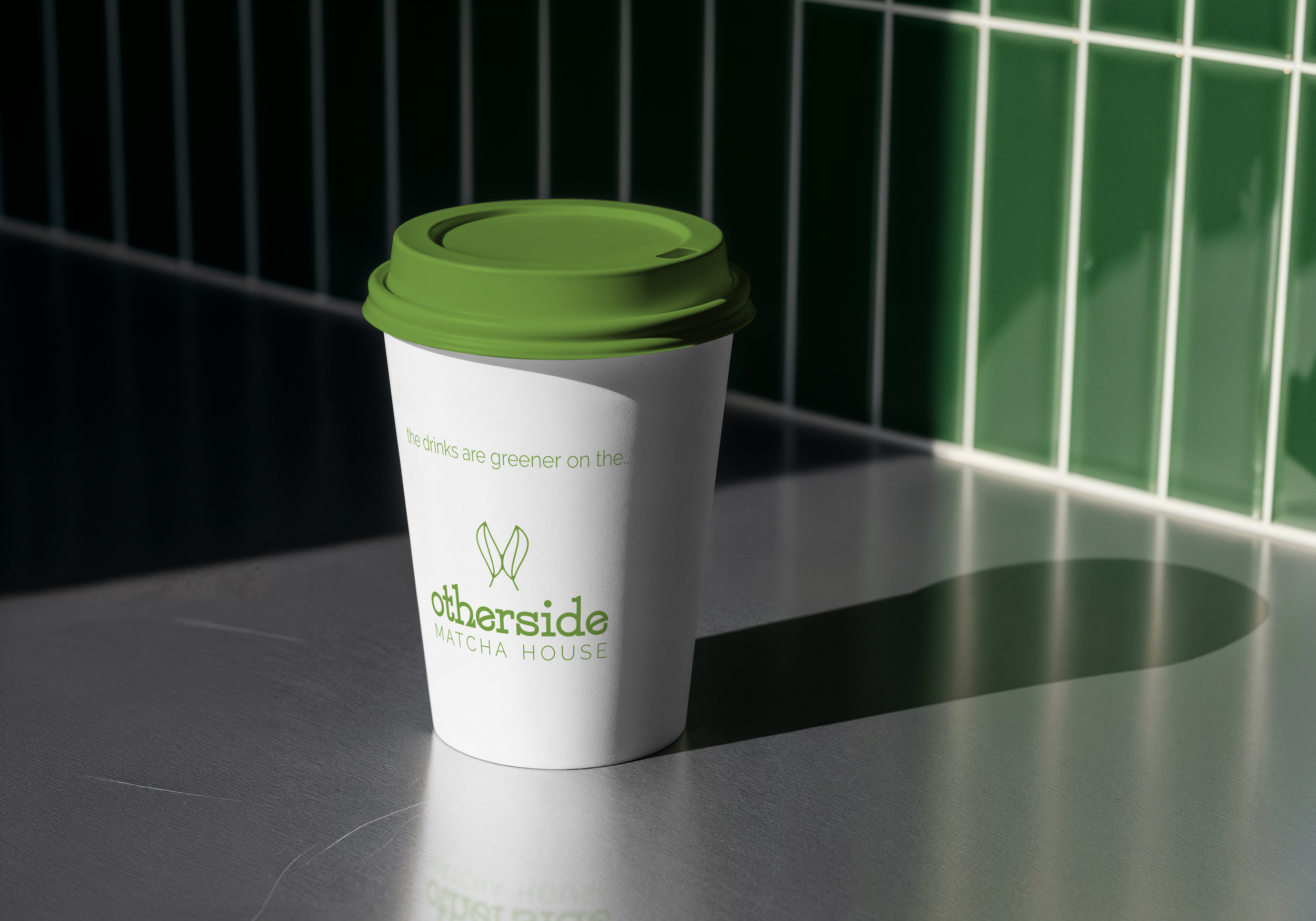 ”The drinks are greener on the…” where the Otherside logo appears underneath. This emphasizes our commitment to quality and that we have the best, most authentic matcha beverages in the region.